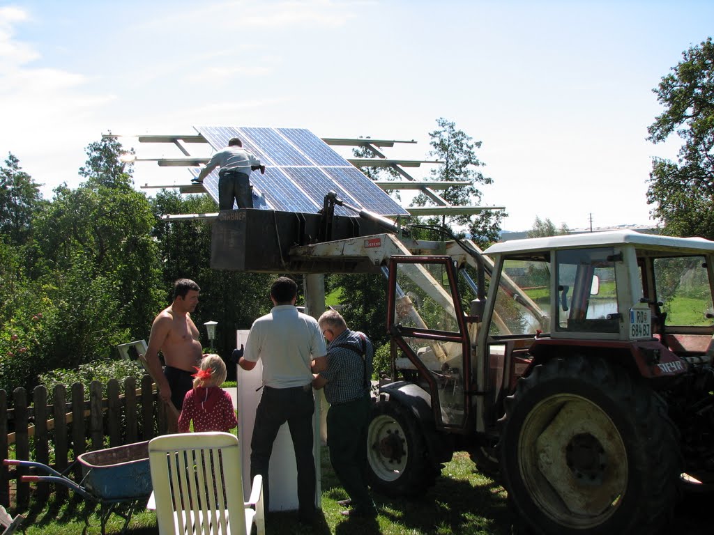Endlich: mittlerweile steht der Mast und die Trägerkonstruktion. Ich gebe zu: ich habe den Arbeitsaufwand unterschätzt. Bisher stecken gut zwei Wochen Arbeit von zwei bis drei Personen in der mechanischen Konstruktion. Vor allem die Schweissarbeiten haben die meiste Zeit gekostet.
